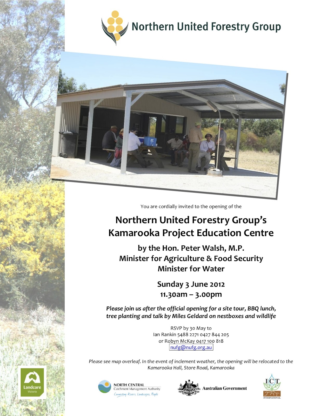 The Northern United Forestry Group (NUFG) would like to announce the official opening of the Kamarooka Project Education Centre, by the Hon. Peter Walsh M.P. on Sunday 3 June 2012 at 11.30am.